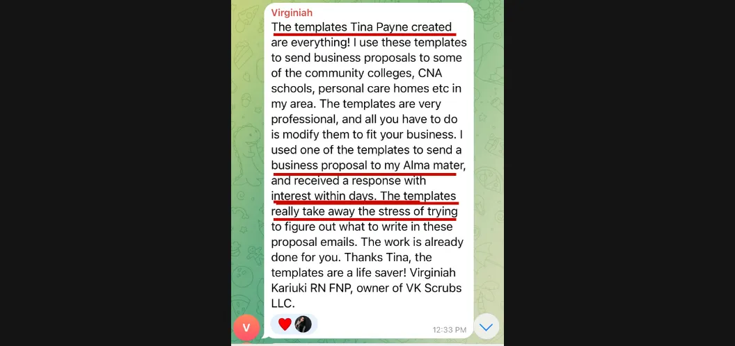 The Ultimate Scrubs Biz DFY Templates, is one of my favorite resources that I happy to share it with my students. My students save hours and money customizing my marketing kit templates and email out proposals within minutes and are getting uniform contracts and meetings set up with decision-makers within days or weeks of their efforts.